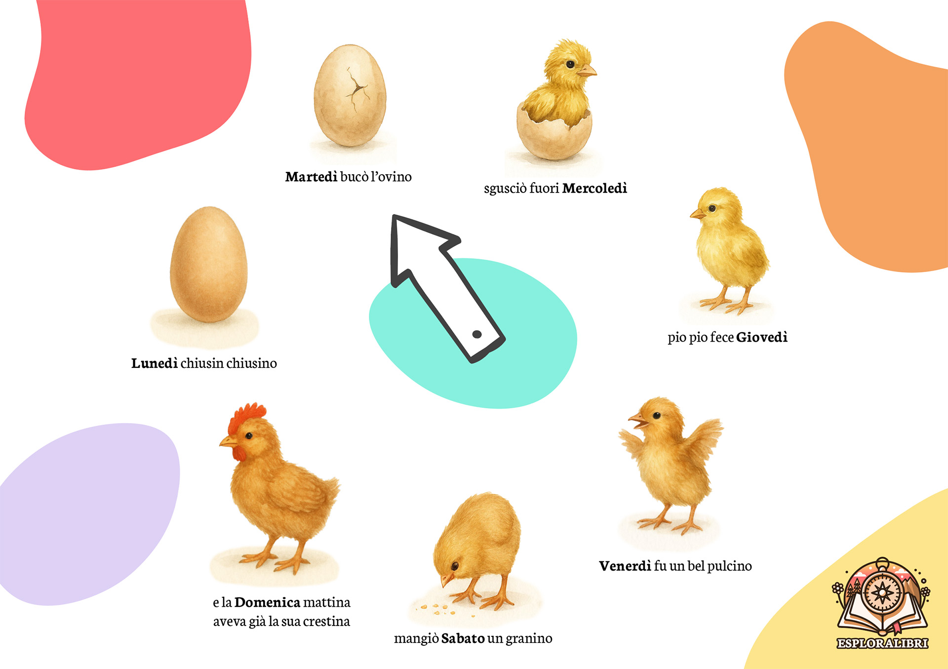 Con immagini delicate in stile acquerello che raccontano il ciclo di vita del pulcino, una freccia da girare ogni mattina e una filastrocca facile da ricordare, questo strumento educativo accompagna i più piccoli nell’apprendimento dei giorni della settimana in modo semplice, giocoso e coinvolgente.